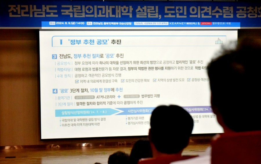 전남 국립 의대 신설 정부 추천 용역주관사인 에이티커니코리아(A.T커니코리아)와 법무법인 지평 컨소시엄 주최로 열린 중부권 공청회에는 의료계와 교육계, 공무원과 일반 시민 등 400여 명이 참석했으나, 순천시와 순천대는불참했습니다.