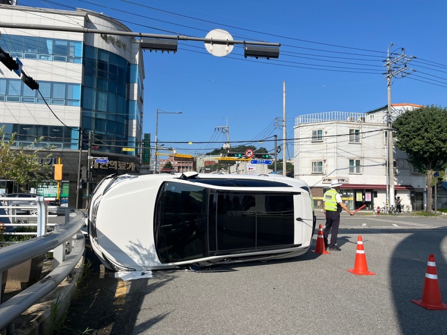 이 사고로 운전석 쪽으로 뒤집힌 SUV는 양림교 안전 펜스를 들이받고 멈췄습니다.