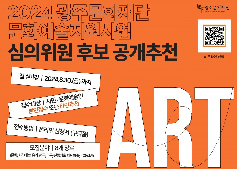 광주문화재단은 8월 30일까지 문화예술지원사업업 심의위원 후보자를 공개추천 받습니다.