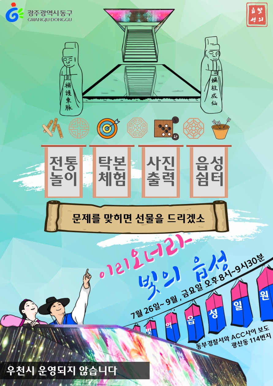광주 동구가 오는 9월까지 ‘빛의 읍성’에서 매주 금요일 저녁 8시부터 한 시간 30분 동안 ‘이리 오너라, 빛의 읍성’ 행사를 개최합니다.