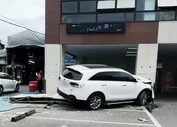 오늘 낮 12시쯤 광주 동구 대인시장 공용주차장을 빠져나오던 70대 남성이 몰던 SUV가 건너편 건물로 돌진해 기둥을 들이받았습니다.