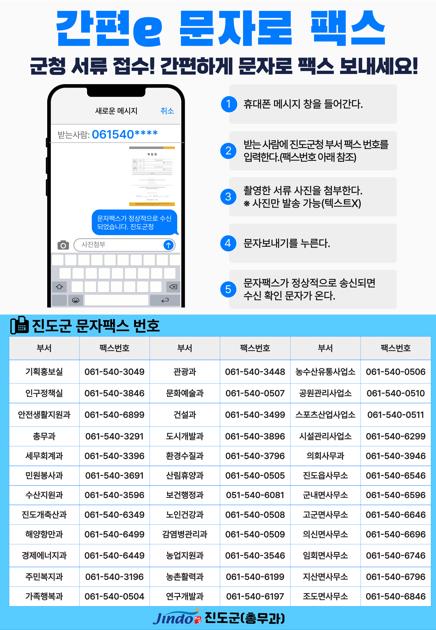 전남 진도군은 민원인이 팩스 대신 문자를 통해 서류를 제출하는 '간편e 문자로 팩스 서비스'를 전남 지자체 최초로 시작했다고 밝혔습니다.