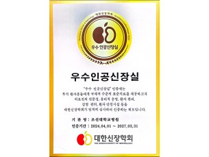 조선대병원이 최근 대한신장학회 주관 인공신장실 인증평가에서 ‘우수 인공신장실’ 인증 기관으로 선정됐습니다.인공신장실 인증..