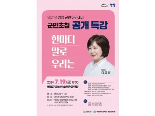 전남 영암군이 오는 19일 1시 30분 청소년수련관에서 이금희 아나운서를 초청, ‘제2회 영암군민 아카데미’를 진행합니다..