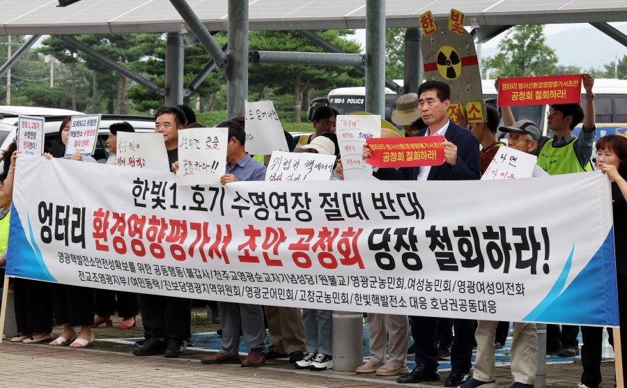 앞서 영광핵발전소 안전성 확보를 위한 공동행동·한빛핵발전소 대응 호남권 공동행동 등 환경단체 회원 150여명은 행사장 앞에서 기자회견을 열어 공청회 철회를 요구했습니다.