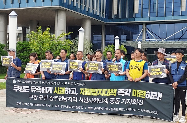 전국택배노동조합 광주전남지부는 "장시간 근무로 과로사 위험에 처한 택배 노동자들을 위해 관련 방지책을 마련해야 한다"고 촉구했습니다.