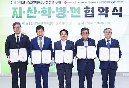 광주시와 전남대 등은 오늘 전남대 본부에서 '글로컬 대학 30 선정을 위한 지자체와 산업체·대학·병원·연구기관, 즉 지·산·학·병·연 업무협약을 체결했습니다.