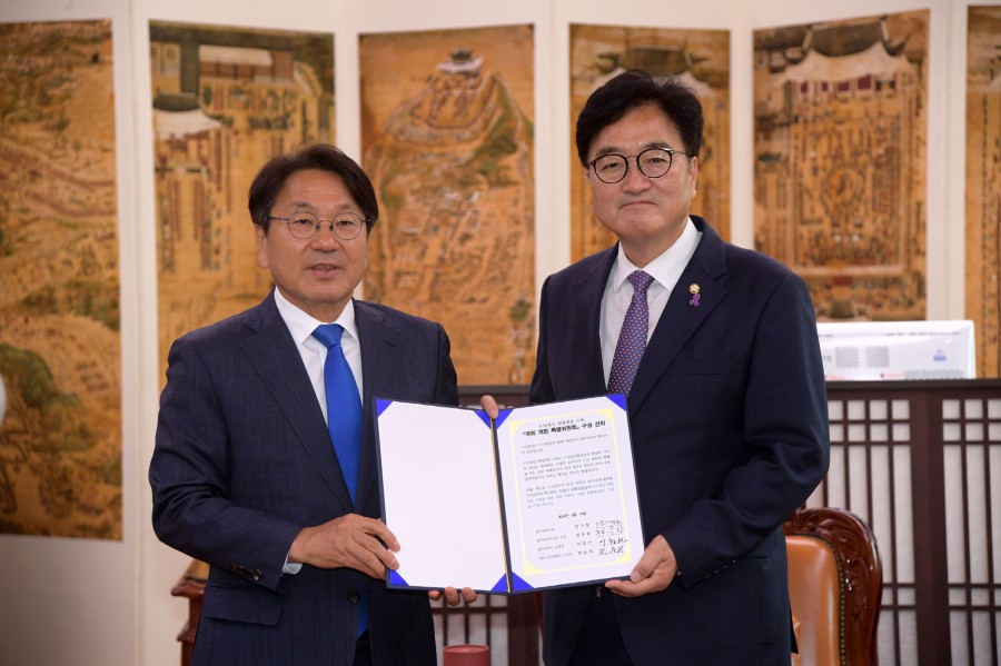 강 시장은 오늘 국회에서 우원식 국회의장을 예방하고 5·18 정신 헌법전문 수록 국회 개헌특별위원회 구성 건의서를 전달했습니다.