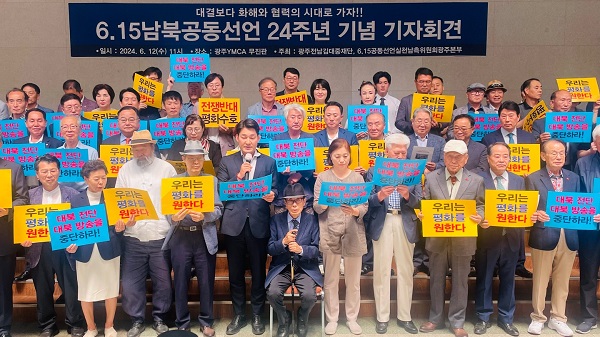 재단은 오늘 오후 광주 동구 YMCA 무진관에서 6·15 공동선언 24주년 기념 기자회견을 열어 "공동선언은 남과 북 두 정상이 분단 55년 만에 처음으로 만난 역사적인 일이다"며 이같이 밝혔습니다.