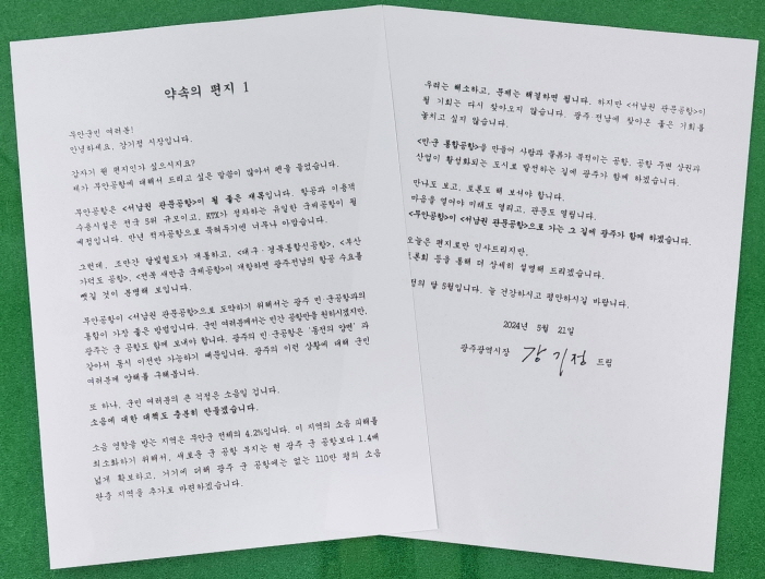 강기정 광주시장은 이를 위해 통합이전의 당위성을 피력한 약속의 편지를 무안군 4만 2천여 가구에 순차적으로 발송하기로 했습니다.