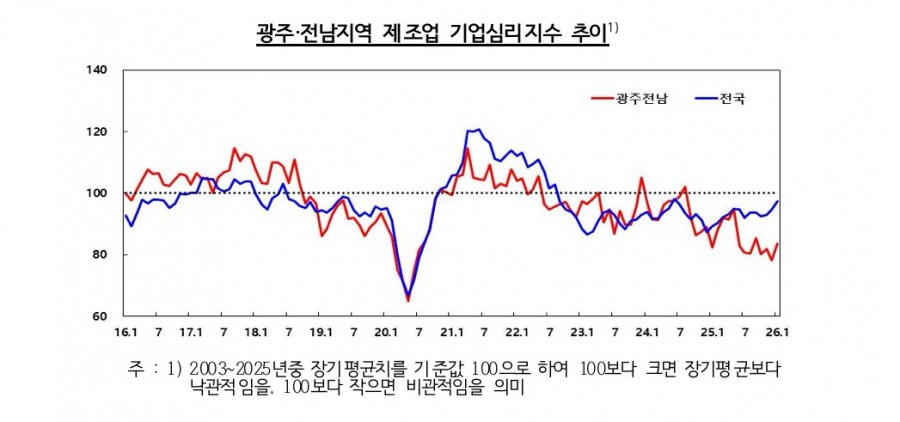 한국은행 광주전남본부가 지역 527개 기업을 대상으로 1월 체감경기를 조사한결과 제조업 기업심리지수는 83.7로 전달보다 5.4 포인트 상승했습니다.