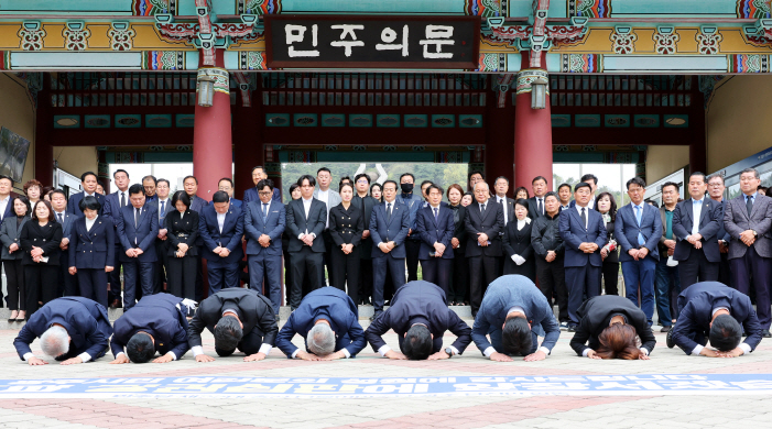 민주의문 앞에서 광주시민들에게 큰절을 올리고