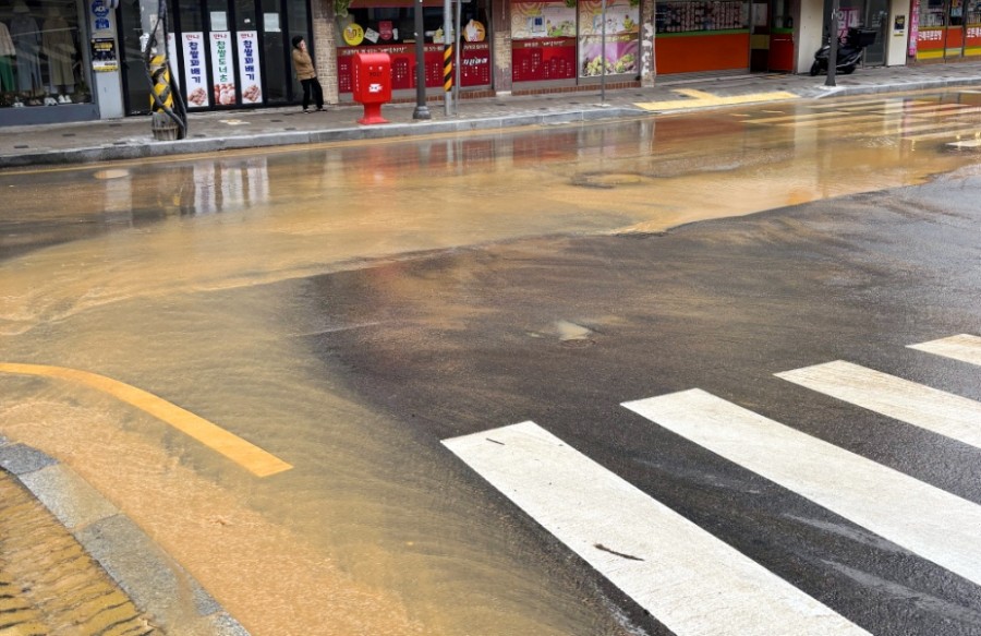 파손된 상수도관에서 물이 흘러넘치면서