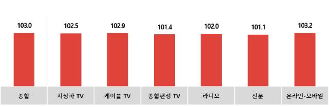 온라인·모바일 103.2, 케이블TV 102.9, 지상파 TV가 102.5로