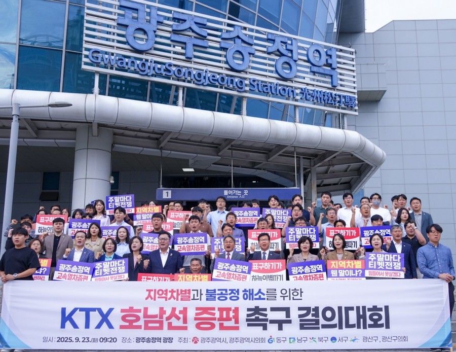 강기정 광주시장과 5개 구청장은 오늘 광주송정역 앞에서 결의대회를 열고 "KTX 호남선은 경부선에 비해 무려 11년이나 늦은 2015년에 개통되면서 지역 차별의 상징이 됐다"며 "KTX 증편을 요구했습니다.