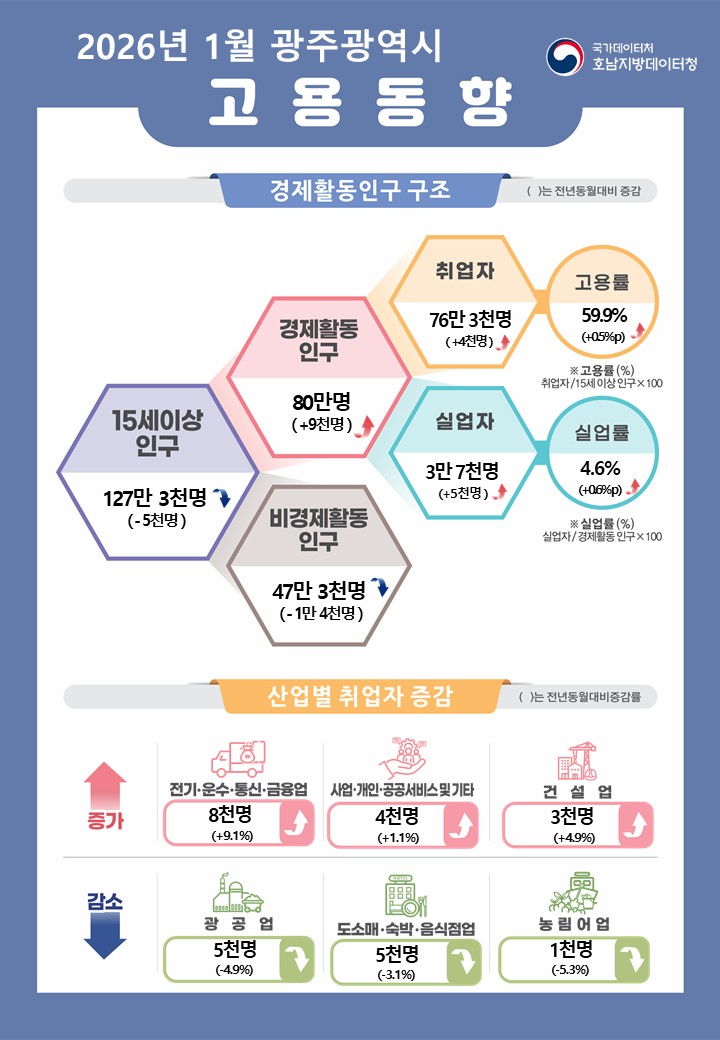 호남지방데이터청이 발표한 1월 광주·전남 고용동향을 보면 광주의 실업률은 4.6%로 전달보다 0.6%포인트 상승했습니다.
