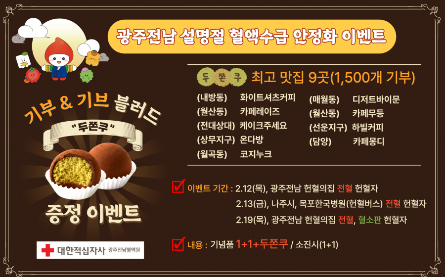 목록 지역 카페 9곳 두쫀쿠 1500개 기부, 설명절 헌혈 이벤트 시작 페이지 정보 작성자 진재훈기자 댓글 0건 조회 56회 작성일 26.02.12 본문 광주·전남 지역 카페 9곳이 설명절을 맞아 헌혈자들에게 제공할 두쫀쿠 1500백 개를 기부했습니다. 대한적십자사 광주·전남혈액원은 오늘부터 사흘간 두쫀쿠 증정 3차 이벤트를 진행한다고 밝혔습니다. 행사는 광주·전남 헌혈의집 9곳과 나주·목포 단체헌혈 장소에서 이어집니다. 참여 카페들은 지역 인기 디저트·커피 매장들로 혈액 수급 안정에 힘을 보탰습니다. 혈액원은 설 연휴 기간에도 대부분의 헌혈의집을 정상 운영합니다. 이전글 광주전남 행정통합 특별법 與주도로 상임위 소위 의결 26.02.12 목록 다음글 김대중 전남교육감 무혐의, 납품업체 주택 거주 의혹 불송치 26.02.12