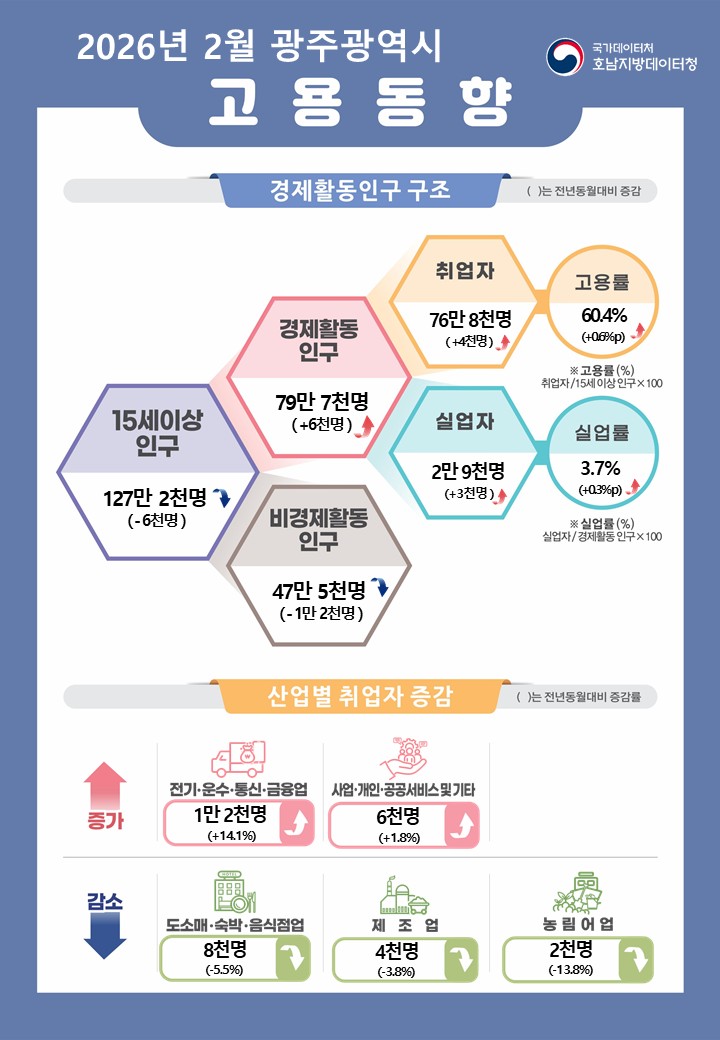 호남지방데이터청이 발표한 2월 광주·전남 고용동향을 보면 광주의 실업자 수는 2만9천명으로 지난해보다 3천명이 증가했고 실업률은 3.7%로 0.5%포인트 상승했습니다.