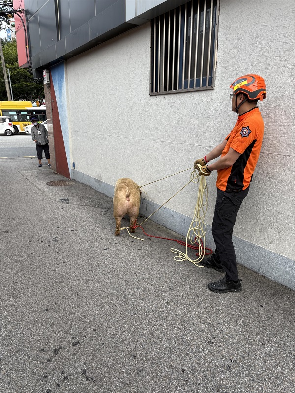 신고를 받고 출동한 소방당국은 밧줄을 이용해 돼지를 곧바로 포획해 트럭 운전자에게 인계했습니다.