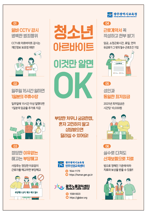 특히 포스터 하단에는 시교육청 민주인권센터와 광주노동권익센터의 상담원 연락처가 함께 안내돼 있어 노동인권 침해 시 즉각적인 상담과 지원이 가능하도록 구성됐습니다.