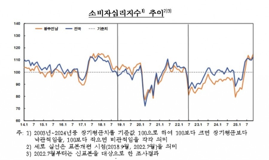 한국은행 광주전남본부가 광주전남 도시 지역 600가구(응답 524가구)를 대상으로 소비자 동향을 조사한 결과 11월 중 소비자심리지수(CCSI)는 114.7로 전달보다 3.4포인트 상승했습니다.