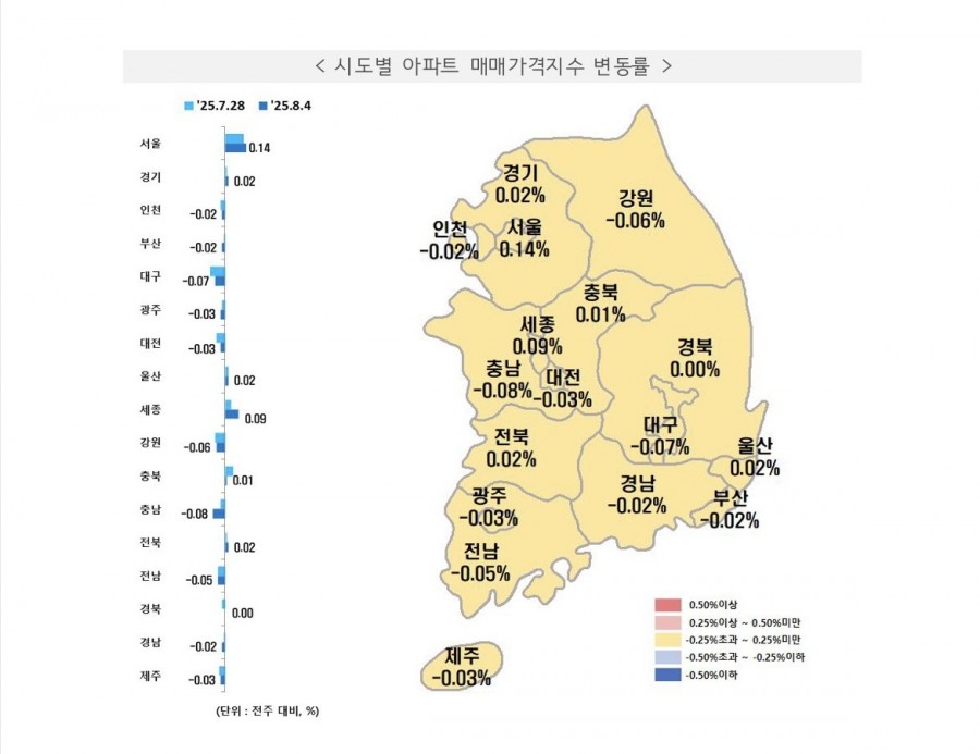 한국부동산원이 발표한 8월 1주 주간 아파트 가격 동향 조사 결과 광주·전남의 아파트 매매가격은 전월보다 각각 0.03%, 0.05%가 떨어졌습니다.