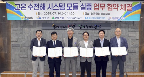 전남도는 어제 (30일) 영광군, 전남테크노파크, 고등기술연구원, 현대건설, 미코파워와 100kW급 고온 수전해 시스템 모듈 실증 업무협약을 체결했습니다.