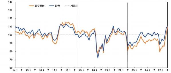 한국은행 광주전남본부가 지역 300가구를 대상으로 조사한 결과 7월 중 소비자심리지수 110.1로 전달 대비 8.6포인트 올라 지난 2018년 6월 이후 가장 큰 상승폭을 보였습니다.