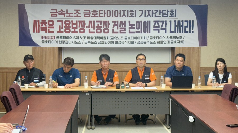 전국금속노조 금호타이어지회는 오늘 금호타이어 광주공장에서 기자간담회를 열고 "사측은 고용보장과 신공장 건설 논의에 나서라"고 요구했습니다.